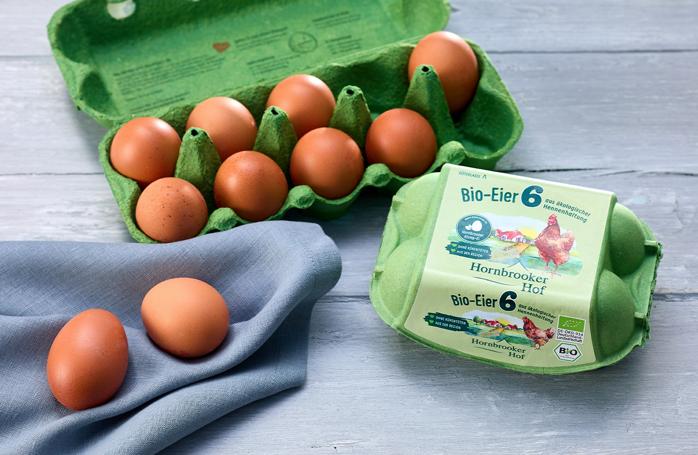 Auf dem Hornbrooker Hof in Nehms werden seit Generationen Eier mit viel Herz für Tierwohl und Qualität produziert. Die Bio-Eier stammen von gesunden Hennen mit Auslauf, werden sorgfältig sortiert und kommen auf kurzen Wegen besonders frisch in unseren Markt.